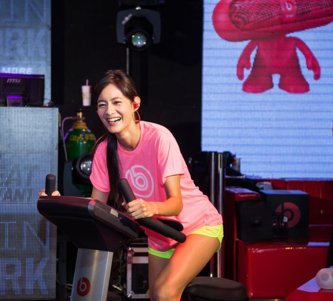 Janet 現場也戴著 powerbeats 2 wireless 騎健身用腳踏車並與幸運媒體PK騎乘距離。